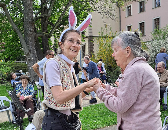 Wenn der Duft von frisch gebackenen Osterbrot durch den Park zieht, Akkordeonklänge die Herzen erwärmen und Eier nicht nur gegessen, sondern auch balanciert werden, dann ist klar: Im Wohnpark Elsa Fenske wird Ostern gefeiert.