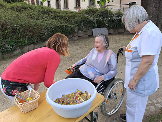 Unter dem Motto „Osterspaziergang“ verwandelte sich der Wohnpark in ein frühlingshaftes Festgelände. Für die musikalische Untermalung sorgte Frau Günther mit ihrem Akkordeon. Bekannte Melodien luden zum Schunkeln und Tanzen ein. Ein weiterer Höhepunkt war die Suche schön selbstgestalteter und gefüllter Osterkörbe. Mit leuchtenden Augen entdeckten die Bewohner ihre Körbe, gefüllt mit bunt gefärbtem Ei, einem Anhänger aus Holz und fröhlichen Fensterbildern – kleine Geschenke die große Freude bereiteten. Auch durften die Bewohner und Bewohnerinnen im Eierlauf ausprobieren. Mit Löffeln, bewaffnet und einem Augenzwinkern im Blick balancierten die Senioren und Seniorinnen ihre Eier durch Parcours. Natürlich durften auch die Köstlichkeiten nicht fehlen. Das frisch gebackene Osterbrot schmeckte hervorragend zum Eierlikör, der in geselliger Runde genossen wurde. Ein Prost auf das Leben und die Gemeinschaft. |