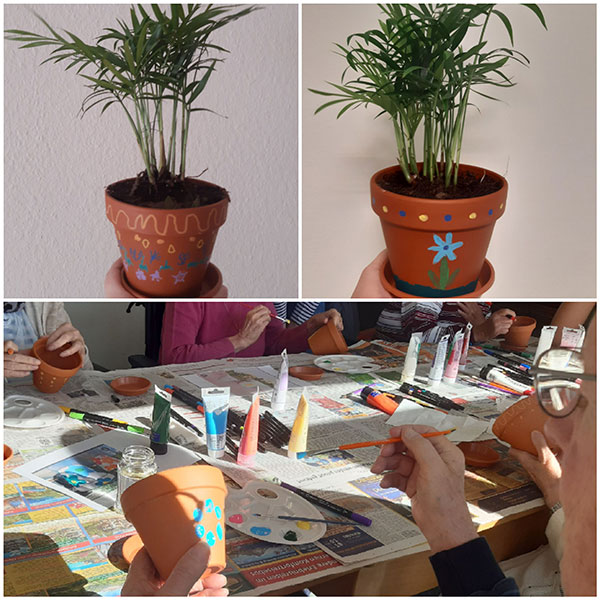 Am 8. Mai bekamen wir Besuch von Auszubildenden des Städtischen Krankenhauses Friedrichstadt. Im Gepäck hatten sie viele bunte Ideen. Interessierte Bewohnerinnen und Bewohner hatten in zwei Gruppen die Möglichkeit, Teller zu gestalten oder selbst bemalte Blumentöpfe zu bepflanzen.