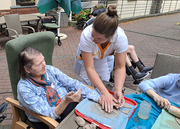 Auf der Terrasse von Haus 2 im Wohnpark Elsa Fenske wurde einen Vormittag lang mit Ton gewerkelt. Neben Untersetzern für die Kaffeetasse oder kleinen Anhängern, konnte auch einfach nur nach Herzenslust geformt werden.