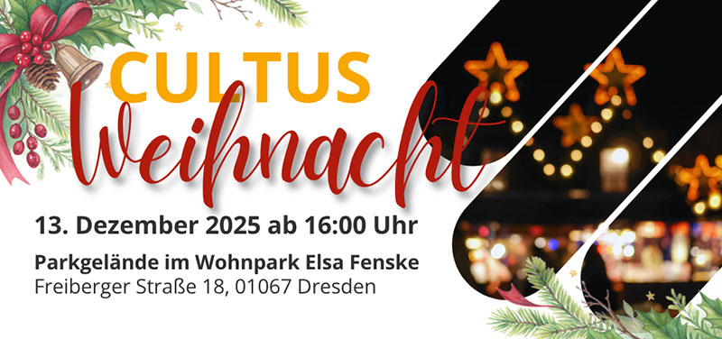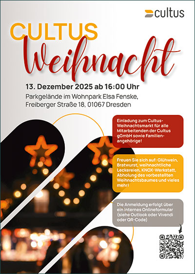 Unser Cultus-Weihnachtsmarkt richtet sich an unsere Mitarbeiterinnen und Mitarbeiter, deren Kinder sowie engsten Familienangehörigen. Die Veranstaltung findet ausschließlich im Freien statt.
